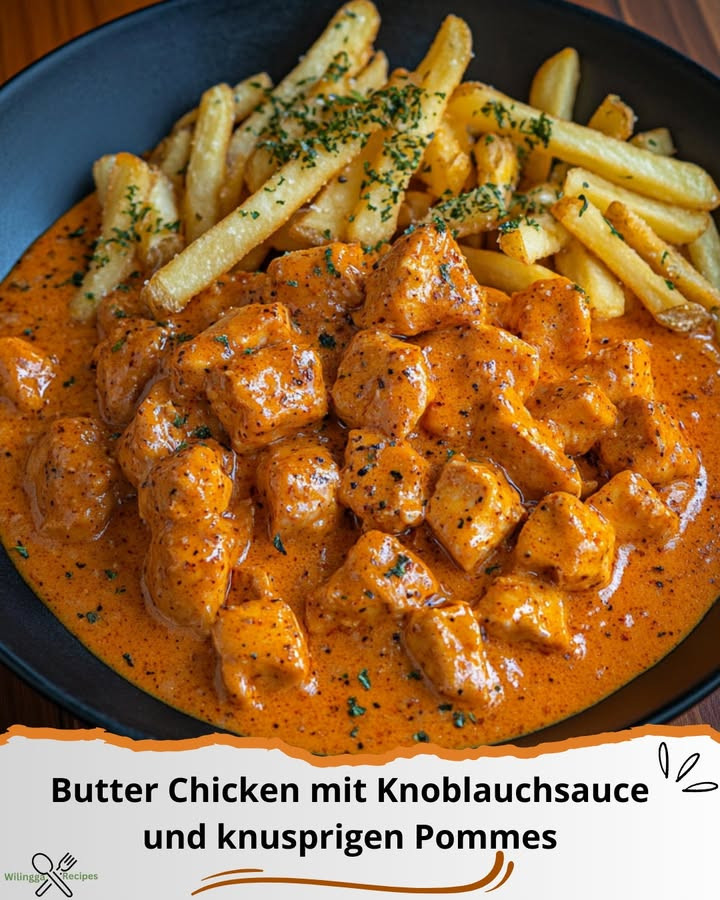Butter Chicken mit Knoblauchsauce und knusprigen Pommes