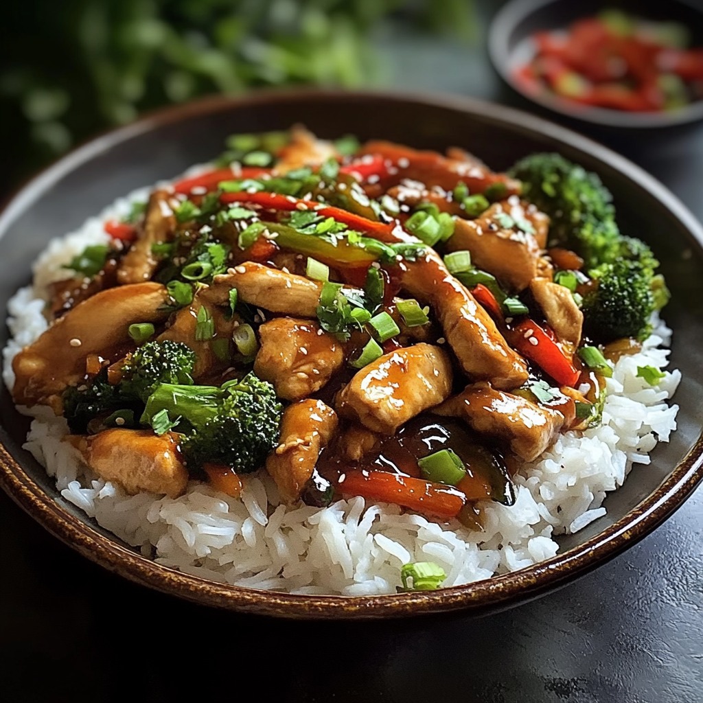 Frisch, würzig und voller Geschmack! Dieses schnelle asiatische Gericht wird mit zartem Hähnchen, knackigem Gemüse und duftigem Reis serviert. ![]()