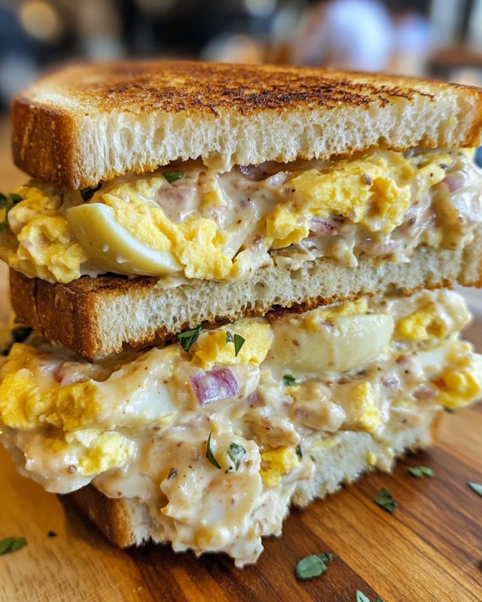 Eiersalat-Sandwiches gehören seit Generationen zu den Klassikern der Mittleren Westens – ein einfaches, aber sättigendes Gericht, das Erinnerungen an Familienpicknicks und sommerliche Mittagessen auf der Veranda weckt. Dieses Rezept ist eine Hommage an diese liebgewonnenen Zeiten und verbindet die cremige Fülle von Eiern mit einem herrlich knusprigen Geschmack, der jeden Bissen zu einem kleinen Stück Himmel macht. Es ist ein Gericht, das zu Herzen geht, perfekt für ein schnelles Mittagessen oder ein leichtes Abendessen und eines, das uns an die Behaglichkeit und Wärme von Zuhause erinnert.