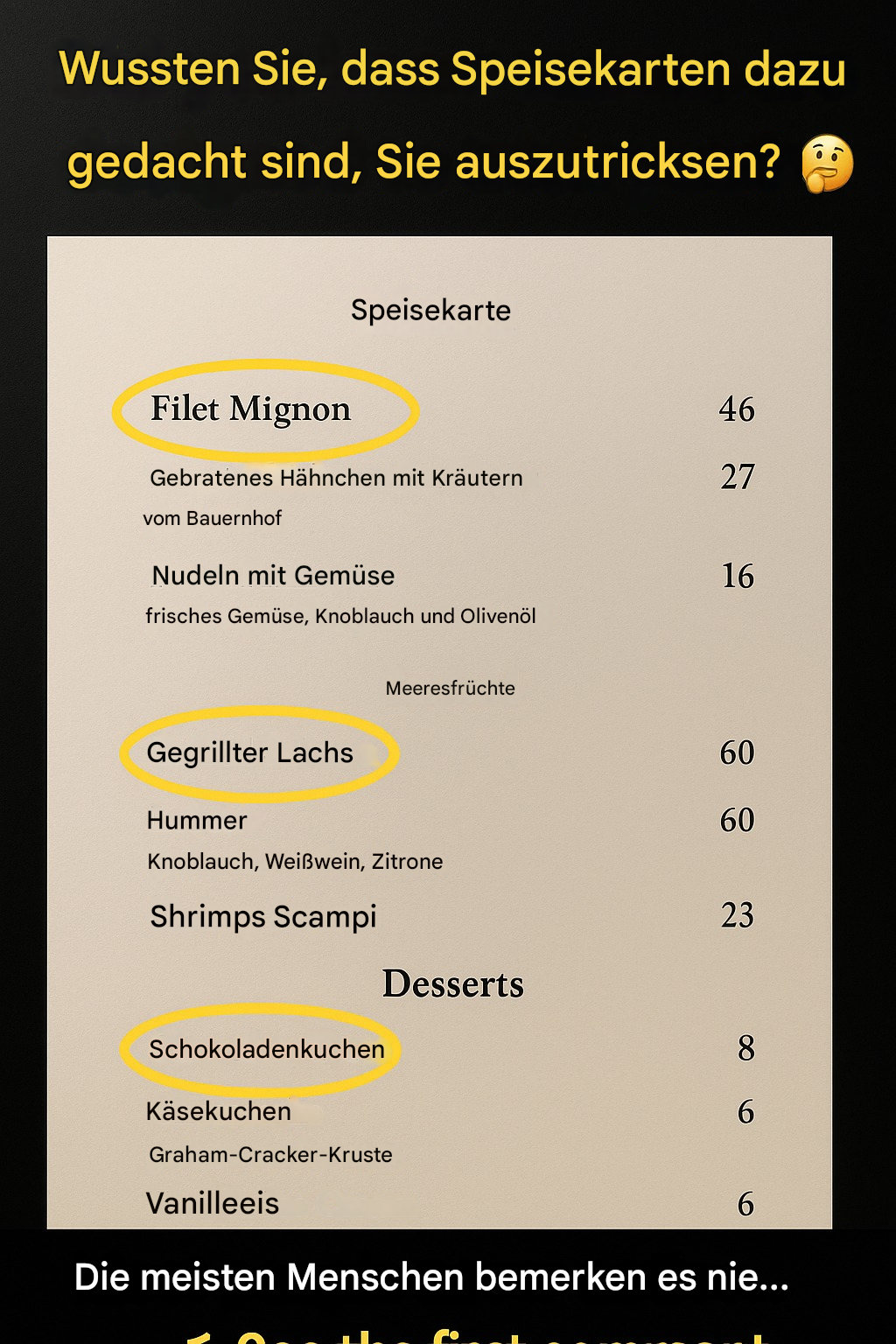 Wenn Sie sich in ein Restaurant setzen, denken Sie wahrscheinlich, Sie lesen nur eine Speisekarte. Doch Speisekarten sind in Wirklichkeit sorgfältig gestaltete psychologische Hilfsmittel, die Ihre Auswahl – und Ihren Geldbeutel – beeinflussen sollen.