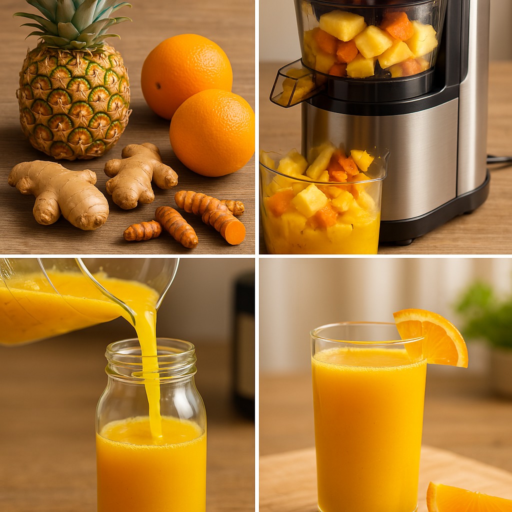 Suchen Sie ein erfrischendes und nahrhaftes Getränk, das Entzündungen bekämpft und Ihre Gesundheit verbessert? Dann sind Sie hier richtig! Dieser Saft aus Ananas, Orange, Ingwer und Kurkuma ist die perfekte Wahl. Er schmeckt nicht nur köstlich, sondern vereint die Kraft dieser Zutaten und bietet so zahlreiche gesundheitliche Vorteile.