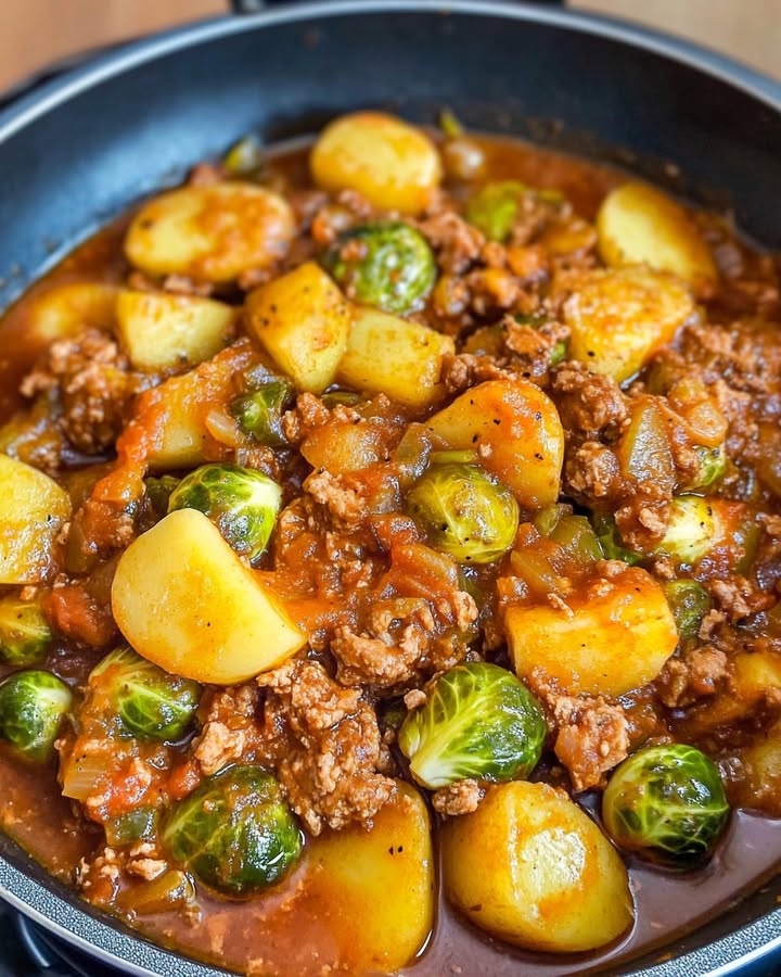 500 g Rosenkohl (geputzt), 500 g Kartoffeln, 500 g Hackfleisch (z. B. Tatar), 1 TL Öl, 2 EL Tomatenmark, 2 TL Paprika edelsüß, 1 TL Gewürzmischung für Hackfleisch, 400 g passierte Tomaten, 500 ml Gemüsebrühe, Salz, Pfeffer