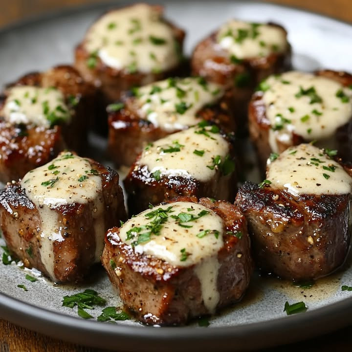 Knoblauchbutter Steakbissen mit Parmesan-Cremesauce