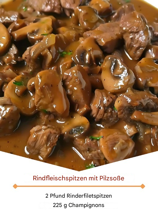 Es gibt nichts Besseres als den reichhaltigen, wohltuenden Geschmack von Rindfleischspitzen mit Pilzsoße . Dieses klassische Gericht vereint zarte Rindfleischstücke, würzige Pilze und eine samtige Soße, die jeden Bissen mit purem Genuss umhüllt. Ob als herzhaftes Sonntagsessen oder als kleiner Genuss unter der Woche – dieses Rezept verspricht maximalen Geschmack mit minimalem Aufwand.