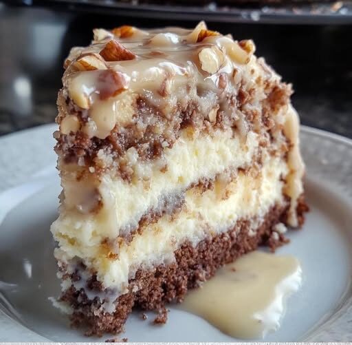 Diese köstliche Variante eines klassischen deutschen Schokoladenkuchens kombiniert die leichte, fluffige Textur eines weißen Kuchens mit einem cremigen Käsekuchenkern und dem nussigen Geschmack von Kokos-Pekannuss-Zuckerguss. Perfekt für besondere Anlässe oder einfach zum Verwöhnen!